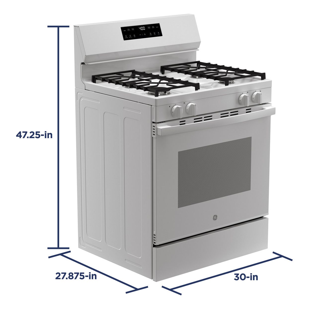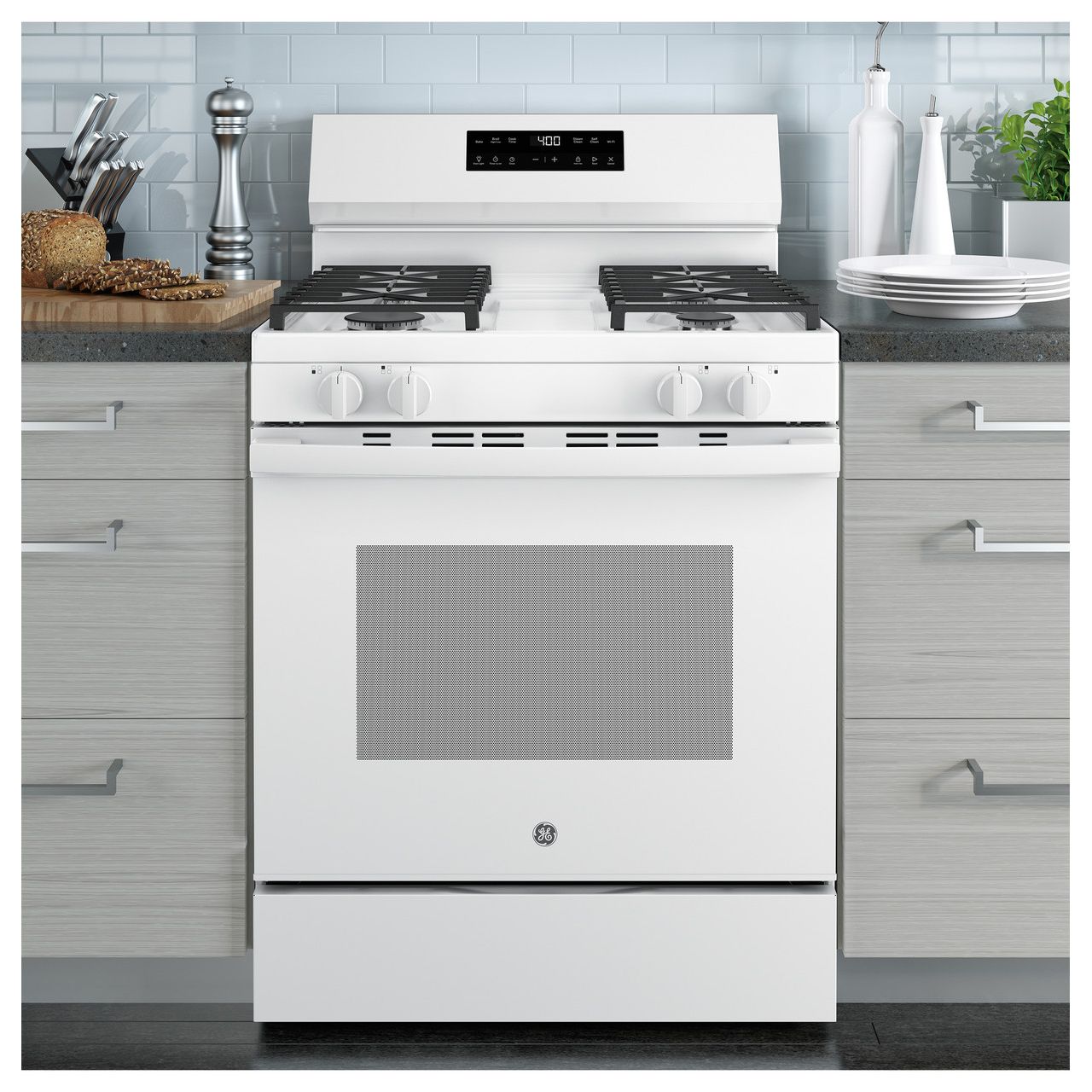 30” White Gas Range with Built-In WiFi, 4 Sealed Burners & 5.3 cu. ft. Oven – Self-Clean & Storage Drawer | GE Appliances