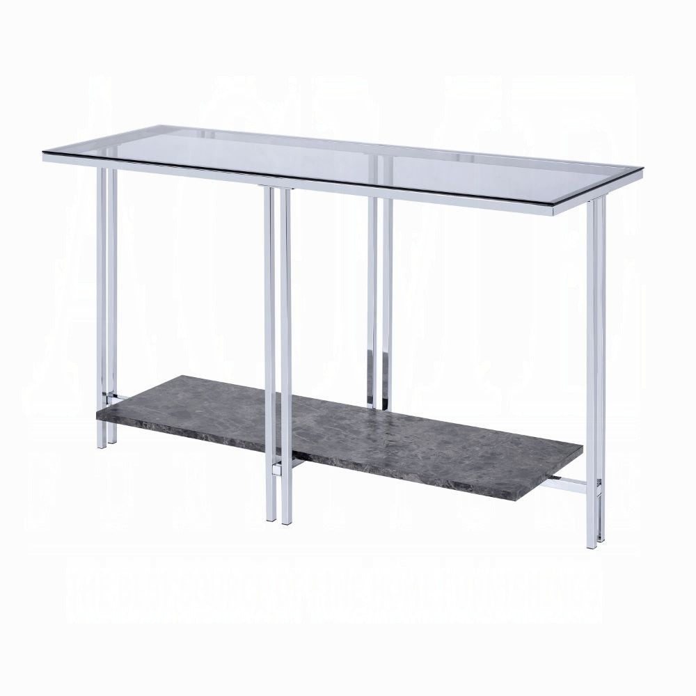 Modern Glass & Chrome Console Table with Faux Marble Shelf