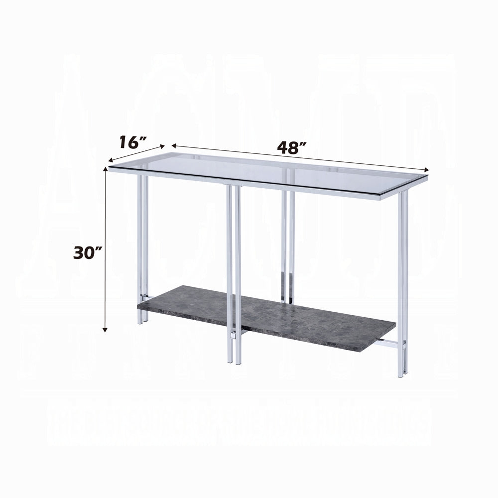 Add a sleek, contemporary touch to your home with this elegant glass and chrome console table. Featuring a clear tempered glass top and a polished chrome frame, it perfectly balances transparency and shine for a clean, upscale look. The lower faux marble shelf adds texture and contrast, offering both style and extra storage space for décor, books, or small essentials. Ideal for entryways, living rooms, or hallways, this versatile piece brings modern sophistication and functionality to any setting.